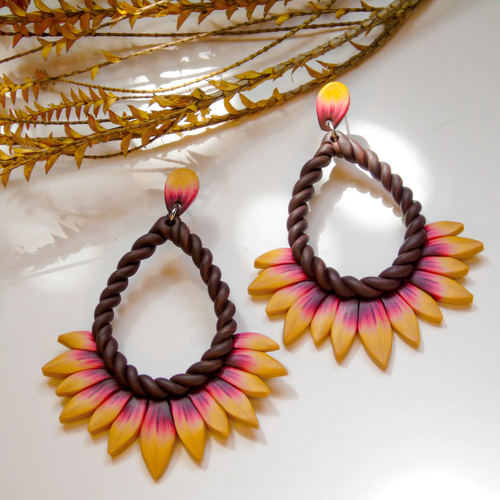 Par de brincos tamanho grande com base. Formato de gota com efeito "corda" marrom escuro e "cocar" com efeito de cores em degradê.
